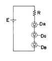 また、図13に示すように、同一チップ面積の赤色発光ダイオードDR、緑色発光ダイオードDG、青色発光ダイオードDBを直列接続し、且つ限流要素としての抵抗Rを直列接続したものもある。