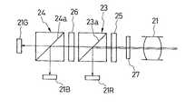 図中において、21は結像レンズ、22R,22B,22Gはそれぞれ赤,青,緑の各色の画像を撮像する固体撮像素子である。結像レンズ21で撮影した被写体像は、色分解光学系によって3色に色分解されて、それぞれ固体撮像素子22R,22B,22Gによりそれぞれ電気信号に変換されるようになっている。而して、色分解光学系は、2個の偏光ビームスプリッタ23,24と2個の位相板25,26とから構成される。偏光ビームスプリッタ23,24は、前述した第1の実施例の偏光ビームスプリッタ11,12と同様の構成となっている。結像レンズ21に近い側の偏光ビームスプリッタを第1の偏光ビームスプリッタ23とし、また結像レンズ21から遠い側の偏光ビームスプリッタを第2の偏光ビームスプリッタ24とする。また、両偏光ビームスプリッタ23,24間に位置する位相板25は、前述した第1の実施例の位相板13と全く同様の構成を有するものであり、この位相板を第2の位相板26とする。また、第1の偏光ビームスプリッタ23における結像レンズ21側に位置する位相板は第1の位相板25とする。さらに、この第1の位相板25と結像レンズ21との間には、結像レンズ21から入射される光をP偏光となるように調整する偏光板としての液晶板27が介装されている。