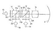 色合成光学系10は、第1,第2の偏光ビームスプリッタ11,12と、これら2つの偏光ビームスプリッタ11,12間に配設した位相板13とから構成される。偏光ビームスプリッタ11,12は、それぞれ45°の角度をもって偏光分離膜11a,12aが設けられている。