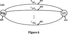 言語モデルは、より複雑な単語列の場合、他の言語モデルを参照することも可能である。これについては、前述の「機能的有限状態文法」という名称の同時係属出願に説明されている。例えば、図7に示す言語モデルLM4は、認識することが可能な1から99までの全ての数を定義するために前述の3つの言語モデルLM1、LM2及びLM3を参照する。例えば、701、702及び703の各経路は、上に述べた単語「1」、「13」、「50」等の一致を得るための言語モデルである。これらの経路701〜703によって、前述の3つの言語モデルのいずれかが一致モデルであると判断されると、言語モデルLM4は一致モデルとなる。さらに、余りの数を扱うため、もしLM3が一致モデルであると判断されたとすると、例えば経路704をたどって、中間状態705に達することが可能である。LM3の経路704から中間状態705を経て余りの経路706をたどると、例えば「21」や「99」など、言語モデルLM3とLM1からなる一致モデルの組合わせとして数が認識される。認識装置220の決定アルゴリズムによって、どちらの状態がより高い確率を有するかが決定され、この情報を用いて、認識された単語列が情報221としてインタプリタ230へ送られる。