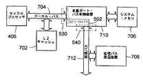 図6に示す構成は、図7に示すような現代のパーソナル・コンピュータ構成に特に応用できる。本発明のコンピュータ・システムでは、1個以上のマイクロプロセッサ406がローカル・バス704に結合され、このローカル・バスは、アドレス、データおよび制御の各ライン(例えば図6のバス510、512および514)を含むものである。第二レベル(L2)キャッシュ702がローカル・バス704に結合され、このローカル・バスが逆に多重ポート・バス制御装置710に結合されている。スピン・バッファ502が多重ポート・バス制御装置710中に含まれ、この多重ポート・バス制御装置710上のポート530および540がスピン・バッファ502上のポート530および540に対応する。図5および6のセマフォー・メモリ504は、多重ポート・バス制御装置710中の別個のメモリ(図示せず)であってもよいし、システム・メモリ706の一部であってもよい。拡張バス周辺装置708が図6のPCI装置406Eおよび406Fに相当し、ポート540に結合された拡張バス712(例えばPCIバス550)を介して多重ポート・バス制御装置710に結合されている。図7に示す具体的な実施態様では、多重ポートバス制御装置710中のスピン・バッファ502が、ローカル・バス704に結合された個々のマイクロプロセッサ406の間で、また、拡張バス712を介してポート540に結合された拡張バス周辺装置708の間で判別を行う。このように、図7のスピン・バッファ502は、異なるセマフォーに対する並行アクセスを許しながらも、共用リソース(例えばシステム・メモリ706)のデータ完全性を達成し、それにより、システム性能を高める。