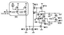 また文献3(ISSCC1999  p.p 180-181 "A2BPararell  1.25Gb/s  Interconnect  I/O  interface  with  Self  Configurable  Link  and  Plesiochronous  Clocking")には、位相インターポレータとして、図16に示すような構成が開示されている。図16を参照すると、制御信号Ictlに応じた出力電流を出力する電流出力型のデジタルアナログ変換器(DAC)と、DACの出力電流を第1のカレントミラー回路(MN74、MN75)で折り返し、折り返した電流を第2のカレントミラー回路(MP73、MP74)で受け、その出力ミラー電流を、差動クロック入力IN、INBを入力とする差動対回路に対して供給し、第1のカレントミラー回路(MN74、MN75)の第2の出力端をなす定電流源トランジスタMN73から差動対回路に電流を供給し、差動対回路の出力からはクロックINを位相シフトしたクロックOUT、OUTBが出力される。なお、差動対回路において、共通接続されたソースが定電流源トランジスタMP73に接続され、ゲートに差動クロック対IN、INBが入力されるNチャネルMOSトランジスタMN71、MN72と、ソースが共通接続されて第2のカレントミラー回路の出力トランジスタMP74のドレインに接続され、ゲートに差動クロック対IN、INBを入力とし、ドレインがそれぞれNチャネルMOSトランジスタMN71、MN72のドレインに接続されたPチャネルMOSトランジスタMP71、MP72を有し、NチャネルMOSトランジスタMN71、MN72のドレインから出力OUT、OUTBが取り出される。NチャネルMOSトランジスタMN71、MN72のドレインとグランド間にはそれぞれ容量C1、C2が接続されており、またNチャネルMOSトランジスタMN71、MN72のドレイン間には、NチャネルMOSトランジスタMN76、MN77が直列に接続され、NチャネルMOSトランジスタMN76、MN77がオンのとき、出力OUT、OUTBは中間電位VDDに充電される。