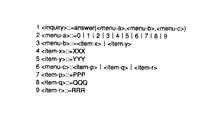 まず、図1において実行制御手段21は、入出力装置1より起動が指示されると、メニュー記述デコード手段22を指示し、メニュー記述ファイル31の読み込みを行う。メニュー記述ファイル31は生成コードファイル35を導き出すためのメニュー問い合わせの内容と、出力フォーマットが記述されている。説明に用いる例では生成コードは図3に示すBNF記法の構文とする。図3を参照すると生成コードは3つの要素から構成され1つ目が0〜9の数字選択(図3の2行目)、2つ目がXXXまたはYYYの選択(図3の3行目)、3つ目がPPPまたはQQQまたはRRRの選択(図3の6行目)となっており、生成コードとしては例えばanswer(3,XXX,RRR)になることがわかる。これに対応するメニュー記述ファイルの例が図5であり、図5を参照すると図3のBNF記法の構文を導き出すためのメニュー問い合わせの内容、出力フォーマットが定義されていることがわかる。