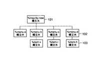 よって、ファイルデコード手段23により、旧木構造に沿った形式で保存されているサービス定義結果ファイル33を読み込んだ場合は、一度は図9の旧形式に同じ木構造のサービス木構造データが構築されるが、構文木91(図9)に対応するメニューデータ(図8の81)に互換情報記述があるため木構造が再構築され、結果として図10に示すサービス木構造データが構築される。図9の旧形式の木構造データに比べ、101が要素4つを持つ親構文木として作成、旧形式の親構文木は削除、そして102〜103の構文木が新たに増えたことになる。コード生成、サービス定義結果ファイルへの保存については先の説明に同様だが、生成されるコード、サービス定義結果ファイルの内容は新しい仕様に自動的に置き換えられたことになる。例えば生成コードファイル35の内容は、サービス木構造データが図10になったことでanswer(3,XXX,RRR,HHH)として生成されることがわかる。