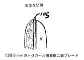 この態様は、きわめて薄い(0.005 インチ未満)ブレード104が固定シールド106によって補強されるため、小さな(5mm以下)トロカールに特に適している。ブレード104に付け加えられる塊(シールド)は、組織と切断する際のプラットホームにもなる。
