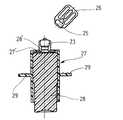 図5から7に示される第3の実施態様は第2の実施態様とは、より小さな容量でありそのため容器の本体22の軸方向の長さがより短かい点と、他の把持部材として追加の半径方向に突出するフランジ29がブッシュ27の外側に直接形成されている点とで、相違している。頸部23、頭部25、及びその把持部材26は第2の実施態様におけるように正確に形成されている。他のそれぞれの特徴部分に対し他の実施態様の記載が参照される。第3の実施態様は使い捨ての針又は噴射装置として形成することができる。
