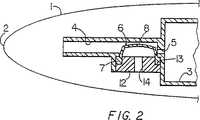 弁6は一般にカップ状を成し、円形断面を有し、その底部7は頂部8より大直径を有し、また頂部8と底部7との間に段部9が配置される。弁6はシリコーンゴムなどの弾性可撓性材料から成る。弁6は筆記具1の凹部10の中に着座し、弁6の段部9が凹部10の段部11に対してリテーナ12によって保持されている。リテーナ12は凹部10の中に押しばめされて弁6を定位置に保持する。環状リッジ(図示されていない)が凹部10の中に備えられて、リテーナ12の環状グルーブの中に「嵌合」するようにする事ができる。あるいは、または追加的に、リテーナ12を接着剤などの任意適当手段によって凹部10の中に固着する事ができる。
