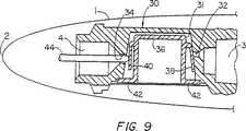 第9図、第10図および第11図に図示のように、弁カートリッジ30が筆記具1の中に組立てられる時、筆記具の中に第2開口34と整列するように取付けられたアーム移動部品44が開口34を通して延在し、弾性アーム40と接触してこのアームを開口34から移動させて、カートリッジ30の使用中にこの開口34を開放状態に保持する。アーム移動部品44は、単一のインクチャンネルキャピラリー溝穴として筆記具の操作中にインクがこのアーム移動部品44を通して流出する事ができるようにし、または多孔性のフィードスティックとし、または通常の穿孔管機構とする事ができる。従って、弁カートリッジ30を筆記具1の中に配置する前には、アーム40が開口34を通るインク流に対して確実なシールを成す事ができるが、カートリッジの設置および筆記具の使用中には、弾性アーム40が部品44によって移動させられて開放位置に保持される事が理解されよう。