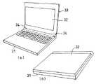 ラップトップ型やノート型のパソコンやワープロ等の携帯用情報機器は、図7(a)に開いた状態の斜視図を、図7(b)に閉じた状態の斜視図を示すように、大別すると2つのユニットから構成されている。すなわち、一方は情報を入力・処理・保存する機能を持つ本体31であり、他方は情報を表示するための表示面32を備えた表示部33である。本体31と表示部33とは、FPC(Flat  Package  Cable)や電線などで電気的に接続されており、本体からの情報を表示部33に自在に表示させることができる。