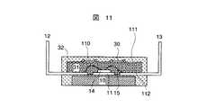 図11は断面構造模式図である。パワー半導体素子14がリードフレーム11にはんだ接着され、Alワイヤ15でリードフレーム11と電気的に接続される。このリードフレーム11はパワー系端子12,制御系端子13を兼ねている点はこれまでの実施例と同様であり、厚さは0.8mm である。このパワー半導体素子14が搭載されたリードフレーム11が熱硬化性樹脂31でトランスファモールドされ、PKG112が形成されている。PKG112はこれまでの場合と異なり、リードフレーム11はPKG中で垂直に折曲げられることはなく、PKG底面でPKG112側面へ出ている。PKG112上面111にはベアチップゲートドライブIC30、及び、ベアチップマイコン110が接着されている。本実施例では、これらの制御回路素子と制御系リードフレームの電気的接続を、銅メッキ配線を3次元的に行って実現している。