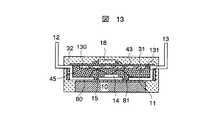 リードフレーム11上にはんだ接着したパワー半導体素子14を熱硬化性樹脂31でトランスファモールドしたPKG45はこれまでの実施例と同様の構造である。本実施例固有の構造は、PKG45上面、すなわち熱硬化性樹脂31の上面に形成された、深さ3mm程度の凹部130である。制御回路を構成するPCB43には、図示のように制御回路IC18の他、多数のチップ抵抗80,チップ容量81等の面実装部品が搭載されている。その中で、チップ抵抗80,チップ容量81等の受動素子はPCB43裏面にはんだ接着されている。PCB43を    PKG45上面に配置する際に、これら部品を配置するための窪みが前述の凹部130である。チップ抵抗80,チップ容量81の厚さは通常1mm程度であり、深さ3mm程度であれば十分である。もちろん、裏面にその他の部品、例えば    IC PKG を実装する場合には、その厚みに応じた深さにしなければならない。この凹部130存在で、両面実装されたPCB43は安定して配置することができる。