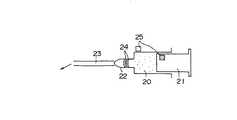 造影剤モード入力部16は、通常モードと造影剤モードの切換えの指示を入力するための装置である。この通常モードと造影剤モードの切換えは、キーボードのキー操作に依存して行われるものでもよいし、造影剤注入装置を起動することを検知するスイッチの出力に依存して行われるものでもよい。造影剤注入装置は、図4に示すように、一端に突出口をまた他端に挿入口を備えた円筒部20とそれに挿入される挿入部21とからなるシリンジを主構成要素とする。造影剤注入装置を用いて造影剤を注入するときには、挿入部21は円筒部20内に深く挿入されるか、またはジョイント22を介して突出口にチューブ23が接続される。したがって、突出口にチューブ23が接続されたことを検知する電極スイッチ24をジョイント22に設けるか、またはシリンジに電磁スイッチ25を設けることにより、造影剤注入装置を起動することを検知することができる。電極スイッチ24は突出口にチューブ23が接続されたときON信号を出力する。電磁スイッチ25は、挿入部21の先端付近に設けられた磁石と、挿入部21を円筒部20に深く挿入したときに磁石と対峙する円筒部20に設けられたコイルとからなり、挿入部21を円筒部20に深く挿入したときのコイルに発生する誘導電流を発生して、造影剤注入装置を起動することを検知し、ON信号を出力する。制御器14は、このON信号を受けて、動作モードを通常モードから造影剤モードに切換える。  The contrast agent