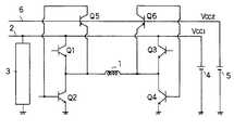 図3に示す第3の実施形態は図2の第2実施形態に対し、トランジスタQ5,Q6のベースの接続位置が異なっている。即ち、この場合、電源ライン2以外に、もう1つの電源ライン6が用意されており、この電源ライン6にトランジスタQ5,Q6のベースが接続された構成となっている。4,5は電源ライン2と6に、それぞれ直流電圧VCC1,VCC2を供給する直流電源を示している。