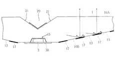 図3において、3種類のLED3(3A〜3C)のうち、いずれか1つのLED3を発光させると、その光は、光入射部15から導光部材1内に適当な広がり角度をもって入射する。上記光の多くは、光入射部15に対向している2つの傾斜面21,21に到達する。ところが、これらの傾斜面21,21は、導光部材1の長手方向に対して傾斜しているために、LED3から傾斜面21,21に直接到達する光の入射角を大きくすることができ、その入射角を、透明部材10の材質によって特定される所定の全反射臨界角よりも大きくすることができる。したがって、LED3から導光部材1内に入射した光の大部分が、上記傾斜面21,21の非透光面22以外の領域を透過して外部に出射することはない。上記傾斜面21,21によって反射された光は、その後導光部材1の長手方向に進んでゆくこととなる。