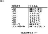 図12に示されるように、地域−放送プラットフォーム−放送局関連表406は、地域情報表405(図11)、放送プラットフォーム情報表404(図10)、および放送局情報表407(後述する図13)との関連を表している。この例では、例えば、放送プラットフォームID「Terrestrial」の、放送局IDが「JOAK」で行われている放送は、地域IDが「Tokyo」ではチャンネル番号「1」とされ、地域IDが「Nijima」ではチャンネル番号「52」とされているというように関連付けられている。このように、同じ放送局IDの放送局で放送されている番組であっても、放送されている地域IDが違う場合、異なったチャンネル番号で管理されることになる。