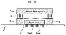 本発明における第1の実施の形態について図1,図2,図12および図13を用いて説明する。図1は、本発明の基本的な構成を示す図である。図1において、1は基板、2はCPUパッケージ、3は電荷蓄積手段、4はCPU端子、303aは+端子、303bは−端子である。次に、図2は図1に示す電荷蓄積手段3の断面および裏面(端子面)を示した図である。図2において、図1と同じ構成要素には同一の記号を付与している。その他、図2において、301a,301bは金属板、302はモールド材、304a,304bは電極材、305はセパレータである。