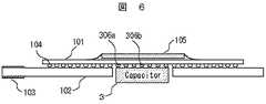 次に図6を説明する。図6は本発明の電荷蓄積手段を用いたCPUコアへの実装断面図であって、他の図面と同じ構成要素には同じ記号を付与している。その他、図6において、101はCPUコア基板、102はCPU基板、103は端子、104は半田ボール、105はCPUコアである。図6において、CPUコア105はCPUコア基板101に実装されており、CPUコア105の入出力端子は電気的にすべてCPUコア基板101に接続されている。CPUコア基板101の裏面には端子にあたる半田ボール104が多数個並んで配置されており、これらはCPU基板102と接続されている。また、電荷蓄積手段3の半田ボール+端子306a,半田ボール−端子306bがCPUコア基板101に接続されている。