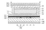 このような本発明における表示用電極は、駆動方式に応じて、一対の基板の両方又は片方に設けられる。例えば、パッシブマトリクス駆動であれば、相交差するストライプ状の電極が対向するように基板の両方に設けられる。TFD(Thin Film Diode:薄膜ダイオード)アクティブマトリクス駆動であれば、島状の画素電極とストライプ状の電極とが対向するように基板の両方に設けられる。TFT(Thin Film Transistor:薄膜トランジスタ)アクティブマトリクス駆動であれば、島状の画素電極と一面に形成された対向電極とが対向するように基板の両方に設けられる。或いは、例えば横電界駆動方式のTFTアクティブマトリクス駆動であれば、いずれか一方の基板に島状の画素電極がマトリクス状に配列される。また、偏光板の配置方法についても、液晶等の電気光学物質の配置状態に応じて各種態様が考えられ、加えて色補正用の位相差板を偏光板に重ねて配置してもよい。