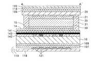 図1及び図2において、第1実施形態における半透過反射型液晶装置は、透明の第1基板10と、第1基板10に対向配置された透明の第2基板20と、第1基板10及び第2基板20間に挟持された液晶層50と、第1基板10の第2基板20に対向する側(即ち、図2で上側表面)に配置された複数のストライプ状の透明電極14と、透明電極14上に配置された配向膜15とを備える。半透過反射型液晶装置は、第2基板20上の第1基板10に対向する側(即ち、図2で下側表面)に透明電極14と相交差するように配置された複数のストライプ状の透明電極21と、透明電極21上に配置された配向膜25とを備える。半透過反射型液晶装置は更に、第1基板10の液晶層50と反対側に、偏光板107及び位相差板108を備えており、偏光板107の外側には、蛍光管119と蛍光管119からの光を偏光板107から液晶パネル内に導くための導光板118とを備える。第1基板10及び第2基板20は、液晶層50の周囲において、シール材31により貼り合わされており、液晶層50は、シール材31及び封止材32により、第1基板10及び第2基板20間に封入されている。更に半透過反射型液晶装置は、第2基板20の液晶層50と反対側に、偏光板105、第1位相差板106及び第2位相差板116を備えて構成されている。