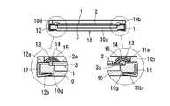 ケース10はセラミックスまたは樹脂などの絶縁性材料で底壁部10aと4つの側壁部10b〜10eとを持つ4角形の箱型に形成されている。ケース10を樹脂で構成する場合には、LCP(液晶ポリマー),SPS(シンジオタクチックポリスチレン),PPS(ポリフェニレンサルファイド),エポキシなどの耐熱樹脂が望ましい。4つの側壁部10b〜10eの内周には環状の段差部10fが設けられ、対向する2つの側壁部10b,10dの内側の段差部10f上に、端子電極である一対の端子11,12の内部接続部11a,12aが露出している。端子11,12はケース10にインサート成形されたものであり、ケース10の外部に突出した外部接続部11b,12bが側壁部10b,10dの外面に沿ってケース10の底面側へ折り曲げられている。この実施例では、端子11,12の内部接続部11a,12aが二股状に別れており、これら二股状の内部接続部11a,12aが段差部10fの両端部近傍に位置し、しかも内部接続部11a,12aは末広がりな逆三角形状をなしている。