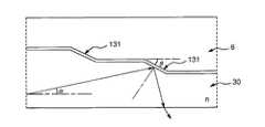 スリット31を透過した光線は、導光体3の上面の平坦部で全反射し、再び伝搬していく。スリット31で全反射した光線は、導光体3の下面から出射するが、下面への入射角は{90−(2θ+α)}であり、スネルの法則より、