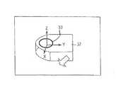 次に、手動送り座標系の原点の指定の仕方の第2の変形例を図10、図11を参照して説明する。これは3D表示画面上で手動送り座標系の原点を直接的に指定する代わりに、図形乃至図形要素を指定し、予め定められた所定のルールに従って座標系原点に定めるやり方である。図10は、3D画面上で円弧を指定する様子を表わしている。図10において、符号33は例えば治具32に形成されている穴で、棒状のワーク(ハンドに把持されているが、図示は省略)をこの穴に差し込む作業を教示した場合などに、この穴をポインタでピックする。すると、教示操作盤20のCPUは、この円弧33の中心の3次元位置を計算し、これを手動送り座標系の原点位置とする。  Next, a second modification of how to specify the origin of the manual feed coordinate system will be described with reference to FIGS. In this method, instead of directly specifying the origin of the manual feed coordinate system on the 3D display screen, a figure or a graphic element is specified, and the coordinate system origin is determined according to a predetermined rule. FIG. 10 shows a state in which an arc is designated on the 3D screen. In FIG. 10,