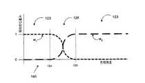 図3を参照すると、本発明の態様による重み付けグラフ140が示されている。重み付けグラフ140は、色相角度θに関して、色空間部分123において使用される特定の色空間に提供される相対的な重みの例を提供する。角度αaとαbとの間の空間は遷移部分126を示す。重みW1とW2は、遷移部分126において遷移が生じるにしたがって、二つの近接する色空間部分123の相対的な重みを提供する。しかしながら、遷移部分126内の色空間の相対的な重み付けは、上記で述べた他、他の比または式などを使用して達成してもよい。遷移部分126内の相対的な重み付けは、色相角度θに比例してもしなくともよい。遷移部分126内のハイブリッド色空間を計算するのに使用される実際の数学的なアプローチは、遷移部分126内に入る、結果としての色の所望の効果に基づいて決定してもよい。このように、当業者は、特定の応用に基づいて、特定の重み付けのアプローチを指定してもよい。