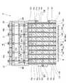ケーシング19内に収容された電極アレイは、複数(図では12個)の第1、第2電極板11,12(板状の電極部材)にて構成されている。これら電極板11,12は、互いに同一形状、同一寸法の導電金属製の四角い平板で構成される。この電極板11,12が、それぞれ前後方向に沿う垂直をなし、互いに左右に等ピッチで並設されている。各電極板11,12の前後両端部が、ケーシング19の前後の長壁にそれぞれ固定され支持されている。  The electrode array accommodated in the