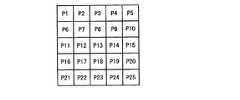 本実施形態で実行されるゲームは、図3に示すようにTVモニタ10に表示された25枚のパネル(パネルP1〜P25)を複数のプレイヤーが奪い合うものである。より具体的には、25枚のパネルのいずれかを各プレイヤーが順次取得していき、その際、オセロゲームのように、他のプレイヤーのパネルを自分のパネルで挟んだ場合にはその他のプレイヤーのパネルを自分のものとすることができる。  In the game executed in this embodiment, a plurality of players compete for 25 panels (panels P1 to P25) displayed on the