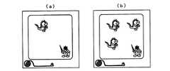 より具体的に説明すると、本実施形態では、プチゲームの難易度は、図17に示す2つの変数(ベース変数およびバイアス変数)に基づいて決定される。ベース変数とは、各プレイヤーが持っているパネルの枚数によって決まる変数であって、0〜2のいずれかの値をとる。パネルの所有枚数が多いほどベース変数が大きくなる。バイアス変数とは、これまでのプチゲームの成功履歴によって決まる変数であって、−2〜0のいずれかの値をとる。バイアス変数は、初期値が0であって、プチゲームに失敗するたびに−1される(ただし−2よりも小さくなることはない)。また、プチゲームに成功するとバイアス変数はリセット(=0)される。これらのベース変数とバイアス変数の合計値によってプチゲームの難易度が決定される。ただし、図17に示すように、数字が0以下の時は0として扱われるため、プチゲームの難易度を示す値は0〜2のいずれかとなる。この難易度に応じて、ステップS15でプチゲームを実行する際のプチゲームの所定のパラメータ(例えば、モンスターの数を示すパラメータや、クリアの妨げとなる障害物の数を示すパラメータや、キャッチすべきボールの数を示すパラメータなどであって、プチゲーム毎に固有のパラメータであってもよい)が変更される。例えば、図18(a)は、難易度が0である場合のあるプチゲームのゲーム画面例であり、図18(b)は、難易度が2である場合の同じプチゲームのゲーム画面例である。同様に、図19(a)は、難易度が0である場合の別のプチゲームのゲーム画面例であり、図19(b)は、難易度が2である場合の同じプチゲームのゲーム画面例である。 More specifically, in this embodiment, the difficulty level of the small game is determined based on two variables (base variable and bias variable) shown in FIG. The base variable is a variable determined by the number of panels that each player has, and takes one of values from 0 to 2. The base variable increases as the number of panels owned increases. The bias variable is a variable determined by the past success history of the petit game, and takes a value of -2 to 0. The bias variable has an initial value of 0 and is decremented by 1 every time the small game fails (however, it does not become smaller than -2). Further, when the small game is successful, the bias variable is reset (= 0). The difficulty level of the petit game is determined by the total value of these base variables and bias variables. However, as shown in FIG. 17, when the number is 0 or less, it is treated as 0, so the value indicating the difficulty level of the petit game is one of 0-2. Depending on the difficulty level, predetermined parameters of the petit game when executing the petit game in step S15 (for example, a parameter indicating the number of monsters, a parameter indicating the number of obstacles that prevent clearing, and a ball to be caught) And the like, which may be parameters specific to each small game). For example, FIG. 18A is an example of a game screen of a petit game in which the difficulty level is 0, and FIG. 18B is an example of a game screen of the same petit game in which the difficulty level is 2. is there. Similarly, FIG. 19A is a game screen example of another petit game when the difficulty level is 0, and FIG. 19B is a game screen of the same petit game when the difficulty level is 2. It is an example.