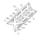 なお、欠除部32a,32bの形成箇所は、上記のものに限られない。例えば、欠除部32a,32bは、各介在片31の長さ方向に沿って一列又は3列以上の各列に沿って形成されていてもよく、また、千鳥足状に配置してあってもよく、さらに、各介在片31の幅方向中央部に形成されていてもよい。また、欠除部32a,32bの形状・大きさも、上記のものに限られない。例えば、三角孔形状、円孔形状であってもよい。