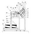 この帳票ストック部27は、丁合コンベア1と平行に設けられ、単片化された送り状202aの位置決めをするストッパ27aと、送り爪27bを有するバッファコンベア27cとを備え、カバー28で覆われている。そして、前記ストッパ27aと前記バッファコンベア27cとは、送り状202aの天地方向の大きさに応じて、図2の仮想線状態に変位可能に構成されている。送り状202aは、同一のバーコード203が付された所定枚数毎に帳票ストック部27に供給され、前記バッファコンベア27cの駆動により丁合コンベア1の載置テーブル11上に区分けポケットに対応して送出するよう構成されている。
