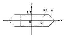図12のベイヤー配列において、全ての画素情報を読み出す場合、G,R,Bの空間解像度は図13に示すようになる。図13において、水平方向(X)および垂直方向(Y)とも「1」はカラーフィルタの無い白黒画像でのナイキスト限界周波数を示している。輝度信号に最も寄与する緑色(G)信号は、水平方向(X)および垂直方向(Y)ともに高い解像度を持つ。また、他の2つの色信号成分となる赤色(R)信号および青色(B)信号も、水平方向(X)および垂直方向(Y)ともに等しい解像度を有し、バランスの取れた色信号解像度が得られる。よって、輝度信号および色信号共に、最も効率良い空間解像度を得ることができる。