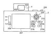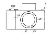 カメラ本体2のグリップ部202の上面にはシャッタボタン206が設けられている。シャッタボタン206の半押し操作と全押し操作とは後述するスイッチS1,S2により検出されるようになっている。スイッチS1がオンになると(シャッタボタン206が半押しされると)、被写体の静止画を撮影するための準備動作(露出制御値の設定や焦点調節等の準備動作)が行なわれ、スイッチS2がオンになると(シャッタボタン206が全押しされると)、撮影動作(CCD205を露光し、その露光によって得られた画像信号に所定の画像処理を行なってメモリカードMCに記録する一連の動作)が行なわれる。