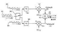 第1の波形発生器305の出力(すなわち、奇数チップ303受信する)は信号i(t)に相当し、第1の乗算器307と接続されていて、それはi(t)cosω0tに相当する信号s1(t)308を発生させるために搬送波信号cosω0tを変調する。第2の波形発生器306の出力(すなわち、偶数チップ304を受信して)は、信号q(t)に相当し、それは前に述べた如く、信号i(t)から1ケのチップタイムTcだけ遅延する。第2の波形発生器306の出力は第2の乗算器310に接続され、それはq(t)sinω0tに相当する信号S2(t)311を発生するために搬送波信号sinω0tを変調する。