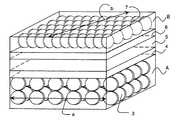 図2に示す位相差板は、ディスコティック液晶性分子(3)を含む光学異方性層A(A)、垂直配向膜(4)、透明支持体(5)、垂直配向膜(6)およびディスコティック液晶性分子(7)を含む光学異方性層B(B)を、この順に積層した構成を有する。光学異方性層Aの遅相軸(a)と光学異方性層Bの遅相軸(b)との同一面内での角度は、60゜である。