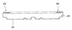 次に、粗剃り内刃26について図7〜図9を用いて詳細に説明すると、粗剃り内刃26は金属板材を断面コ字状に折曲して形成され、当該一対の折曲部42の各端縁には、互いに逆方向に折曲されて形成された第2の歯列44が設けられている。第2の歯列44は折曲部42に対して直交するように外方に折曲されている。