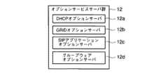DHCPオプションサーバ12aは、動的なIPアドレスの割り当て、及びホストコンフィグレーションを実現する(DNS等)。GRIDオプションサーバ12bは、GRIDアプリケーションをサポートするもので、例えばネットワーク上に個人のディスクスペースを状況に応じて作成するものである。SIPアプリケーションオプションサーバ12cは、SIPを利用するアプリケーションをサポートするもので、例えばSIPフォンや画面共有、SIPプレゼンス管理等を実現する。そして、グループウェアオプションサーバ12dは、例えばスケジューラ、簡易掲示板、勤務管理等をサポートするものである。これら各オプションサービスは、物理的に異なる複数のサーバによって提供されても、一のサーバで論理的に分けられた態様で提供されてもよい。  The