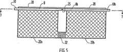 第3の態様を、図5〜7を参照しながら説明する。図5〜7において、図1〜3を参照して上述したセルと同様のセルを示す。図5〜7において、図1〜3の部分の機能に対応する機能を有する部分は、対応する数字で示した。第3の態様においては、膜を領域22(図5)において圧縮及び/又は化学的にブロックして、膜1を2つのセルの部分22a及び22bに分割する。隔壁22を、国際出願PCT/AU96/00210号に記載のように形成し、セル22aと22bの間の液体の拡散を有効に防止し、それにより、隔壁22は、電極8と9の間において各セルを半セルに実質的に分離する障壁11とは異なる機能を果たす。セル22bは、第2または独立した”参照”セルを提供する。キャリアーフィルム20上の第1の電極8をセル22a及び22bの中間の25において分割する。従って、セル22bは、電極8と同時に形成されるが、その後隣接するセル22aの電極8から電気的に絶縁される電極8bを有する。参照電極9bも電極9から電気的に絶縁されてもよいが、両方のセルに共通する単一の連続する参照電極を用いるのが好ましい(図7参照)。本態様においては、校正用化学薬品、例えば、緩衝剤を含んで成る化学薬品を、第2のセル22bに付着し、乾燥する。使用に際して、水分を第2のセルに加え、装置をコネクター10bを経由してEMF測定デバイスに接続し、その結果、第1の電極8bと参照セル22bの参照電極の間の電位差を測定することができ、それにより、装置を校正できる。このアッセンブリをコネクター10を用いてEMF測定デバイスに接続して、検体セル22aの電極8と9の間の電位差を測定できる。検体を第1のセル22aに添加し、検体を含むセル22aの電位を測定する。両方のセルの電位を同時に測定又は比較できるEMFデバイスと接続するように、リードを両方のセルから配置するのがより好ましい。セル22a及び22bの寸法を相当な精度で容易に再現でき、また、両方のセルを実質的に同時に構成するので、第1と第2のセルの間と同様に電極についてほとんどバラツキなく本発明の装置を製造することができる。その結果、検体の測定を相当な精度をもって行うことができる。