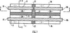 電極8と9の間に障壁を形成するために、1又は2の一方または双方の側から多孔質膜1を圧縮することによって、電極8と9の間に拡散障壁11を形成する。図1の例において、障壁は片側からの圧縮によって形成され、電極8と9の中間において一端6から他端7に伸びている(図2)。膜1と共に電極を組み立てる、または膜1上に電極を付着する前又は後に障壁11を形成してもよいが、電極を形成する前に障壁11を形成するのが好ましい。隔壁11を形成するために圧力を選択的に加えて膜を圧縮する。その結果、得られる圧縮領域を横切るイオン拡散が、未圧縮膜を通過する拡散と比較して十分に減少するが、圧縮領域を横切る電気的接続には十分である程度まで、障壁領域の膜材料の密度を増加させる。本態様においては、これは、50−125KPaの範囲の圧力を加えることで達成される。別法では、限られた領域において膜の孔を化学的にブロック(阻止)することにより、又は本出願人の係属中の国際出願PCT/AU96/00210号において記載するように化学的及び物理的手段の組み合わせにより障壁11を形成してもよい。