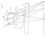 また、このような軸外に発生する各収差の補正効果を増大される観点から、第1レンズ3の第2面を非球面とすることは更に有効である。さらに、この場合には、第1レンズ3の第2面を、光軸8から離れるにしたがって曲率が大きくなる非球面とすることが望ましい。そのようにすれば、軸外の光線を、第1レンズ3の第2面の法線に対して光軸8から離れる方向にさらに急激な角度とすることができ、前述した軸外に発生する各収差の補正効果をより効果的に増大させることができる。  Further, from the viewpoint of increasing the correction effect of each aberration generated off the axis, it is more effective to make the second surface of the