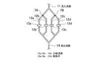 図3及び図4の説明において、流量制御装置1の微細流路は概四角形形状をしていたが、それぞれの分岐流路の長さをそろえるためには、図11に示すように、概Y字形状にするとよい。図11に示す流量制御装置は、分岐点7Aにおいて流入流路11が2本に分岐した分岐流路12a、12b、分岐点7Bにおいて流入流路11が2本に分岐した分岐流路12c、12d、4本の分岐流路12a、…、12d各々に備えられ、開閉することにより圧力源からの押圧液の流れをON、OFFする制御弁13a、…、13d、4本の分岐流路12a、…、12dが合流して1本となった流出流路14で構成されている。このようなY字形状に微細流路を設計すると、流入流路11から流出流路14に至るまで、それぞれの分岐流路12a、…、12dの長さが等しくなる。このため、圧力源から加圧する際に、各分岐流路12a、…、12dにかかる圧力が等しくなり、圧力を容易に制御することができる。