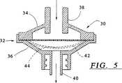 本発明の実施例のバルブ組立体30を示す図5を参照する。このバルブ組立体は互いに係合された二つの部材34,36で構成されたハウジング32を含む。部材34は流体入口38を形成し、また部材36は流体出口40を形成しており、この実施例では出口40はルアー形式(luer-type)コネクタである。膜42が入口および出口の間に配置され、部材34,36の連結箇所によって所定位置に保持される。