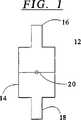 本発明のバルブ組立体の概略図を示す図1〜図4をまず参照する。このバルブ組立体12は液体入口16および液体出口18を有する本体14を含む。(この実施例に関して「出口」および「入口」という用語を使用しているのは、実際のところ、認識されるように単に便宜的なことである。ここに示すバルブは対称的なもので、入口および出口の機能は逆にすることができる。)入口16および出口18の間にはそれらの入口および出口を隔離する弾性膜20が配置されており、この弾性膜は例えばシリコーンゴムで作られる。図2に見られるように、弾性膜20には穴22が形成されており、この穴は、弾性膜の両側間に圧力差が存在していない状態では穴の壁面が圧潰されて、穴が完全に塞がれる位置にある。