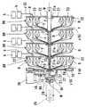 【図4】  図4は、この発明になるFRPスプリングのための組紐組織体を製織するための多連式ブレイダー装置の基本構成の一例を示す概略的な側断面図である。