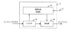図2は、選択伝送部3の構成を詳細に示した図である。選択伝送部3は、選択伝送判定部31と、データを一時的に保持するレジスタ32と、データの転送を実行する転送部33とから構成する。ルーテイング部2よりルーティングしたIPパケットデータは、一時的にレジスタ32に保持し、IPヘッダ内のDS値の解析を選択伝送判定部31により行う。選択伝送判定部31では、予めバッファ4内のデータ量が所定量以上(輻輳時)である場合に廃棄するIPパケットデータのフロー識別子データ及び廃棄を開始・終了する制御コードデータを蓄積保持しておく。ここでは、バッファ4の輻輳時、廃棄するフローとしてBフレームの高周波成分(フロー識別子データ0x1)を設定しておく例によって説明する。