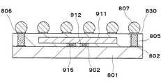 以下に,図9を参照しながら,ICチップ101にICチップ111を搭載する方法を説明する。まず,ICチップ101においては,パッド102,表面保護膜103,104,導体105,106が形成された状態,ICチップ111においては,パッド112,表面保護膜113,114,導体115,116が形成された状態のものを準備する。ここで,ICチップ101は既にダイシングされ個片化されたものでもダイシング前のウエハ状態でもかまわない。