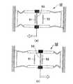 センサ32は、概略、弾性変形部41〜44を介してハウジング45に長手方向両端部を支持され、重り46,47が取り付けられた2本のビーム48,49と2本のビームの中央部に架設された可動電極50と可動電極50を挟む2つの固定電極51,52とからなる。センサ32に(図上)左方向加速度及び右方向加速度が加わった状態を図6(a),(b)にそれぞれ示す。まず、センサ32を含むセンサ部23が傾斜したり加速度を生じたりすると、その傾斜角度あるいはセンサ部23に生じる加速度の大きさに応じて重り46,47がセンサ部23内を移動する。弾性変形部41=44が弾性変形するので、重り46,47は2本のビーム48,49とともに移動し、可動電極50も移動する。可動電極50が移動すると2つの固定電極51,52と可動電極50との距離が変化する。センサ32では、単位時間当たりの静電容量変化から加速度を算出し、あるいは静電容量の値そのものから傾斜角度を算出する。センサ部23では、このようにしてセンサ32によって検出された加速度あるいは傾斜角度を、測定・演算制御部20に出力する。