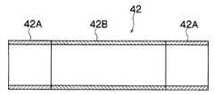 バルーン42は、両端部42A、42Aと中央部42Bとで性質の異なるゴム材が使用されており、両端部42A、42Aは、中央部42Bよりも硬度の高いゴム材が使用されている。例えば。両端部42A、42Aのゴム材としてフッ素ゴムやシリコンゴム等が用いられ、中央部42Bのゴム材として天然ゴム等が使用される。なお、両端部42A、42Aと中央部42Bは、別々に成形して接着してもよいし、同時に二層成形してもよい。また、両端部42A、42Aと中央部42Bの硬度が異なるのであれば、同じ種類のゴム材を使用してもよい。例えば、両端部42A、42Aとして硬度が80°Hs程度のシリコンゴムを用い、中央部42Bとして硬度が40°Hs程度のシリコンゴムを用いてもよい。  The