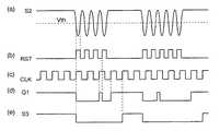 このような信号S2に対して、インバータ回路1541の出力たる信号RSTは、図8(b)に示されるように、信号S2の電圧がしきい値Vthを下回ったときにHレベルとなり、Dフリップフロップ1542、1543をリセットする。この際、Dフリップフロップ1542、1543は、クロック信号CLKの立ち上がりにおいて、その直前での入力端Dのレベルを出力するから、Dフリップフロップ1542の出力Q1、および、Dフリップフロップ1543の出力S3は、それぞれ図8(d)、(e)に示されるようになる。すなわち、受信回路154の出力信号S3は、時計側コイル210によって外部磁界が発生している期間にLレベルとなる信号となる。